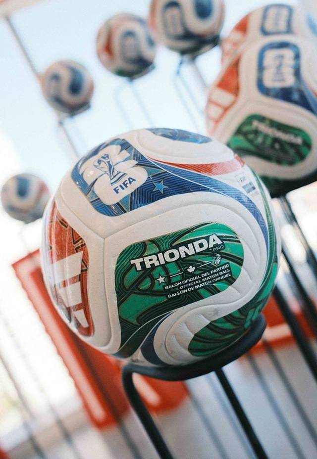 A:当然。TRIONDA三重浪采用全新的四面结构,每面有三条横臂。每条横臂代表一个主办国。 我们选择蓝色代表美国,绿色代表墨西哥,红色代表加拿大。这三种颜色汇聚在每面的中心,形成一个三角形,象征着团结与联系。 然而,我们不希望故事仅仅停留在色彩层面。我们还加入了全球球迷一眼就能辨认的图案——五角星代表美国,枫叶代表加拿大,老鹰代表墨西哥。 这些图案不仅体现在视觉上,也体现在球的纹理上。仔细观察,你会发现小小的星星、树叶和老鹰浮雕在球面上,既具有象征意义,又方便控球。这是一个微妙的细节,但却增添了不少深度。最后,由于这是世界杯用球,我们希望它能带来高端质感——拥有与奖杯本身相符的金色质感。因此,我们在整个设计中融入了金色元素,将其与足球界的最高荣誉直接联系起来。