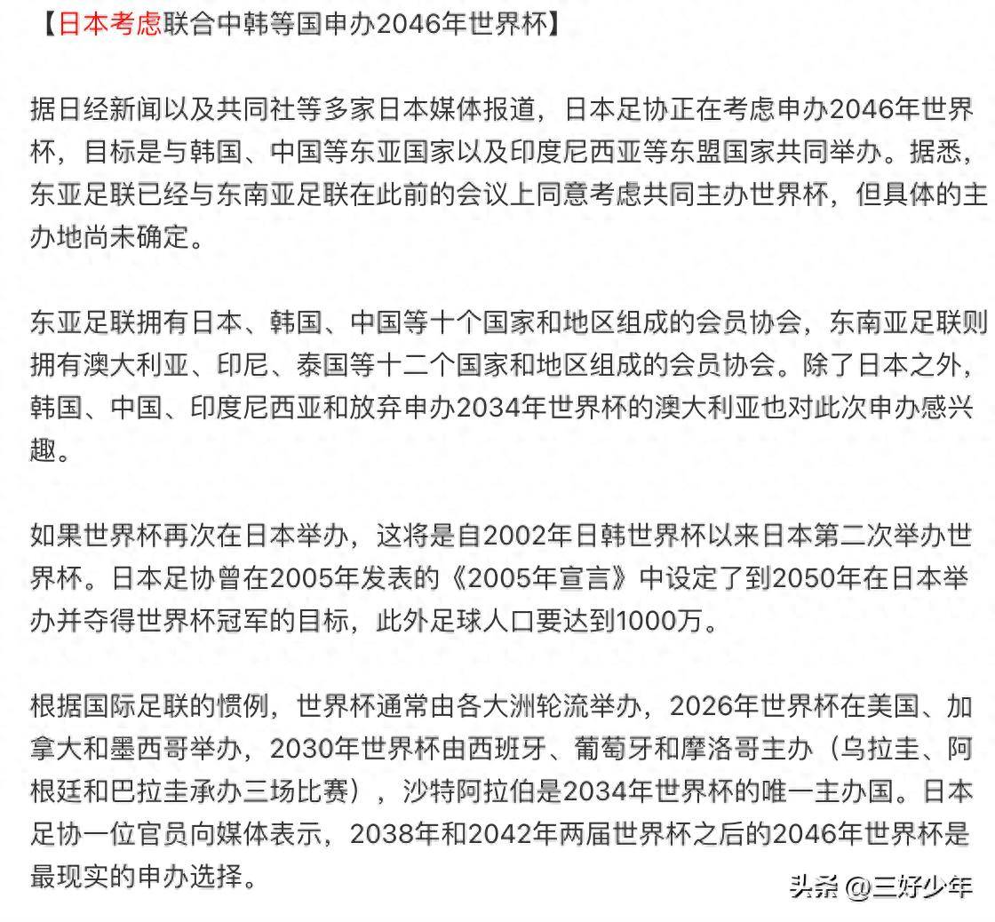 为啥小日子只想跟亚洲国家合作?因为国际足联有规矩:一个大洲办过世界杯后,接下来两届都不能再办。2034,年世界杯定在沙特办,因此,2046,年就是亚洲下次申办的非常好机会。他们不想自己单独办,一是怕花钱太多,二是想借着牵头办的机会,在亚洲足球圈里当,老大。