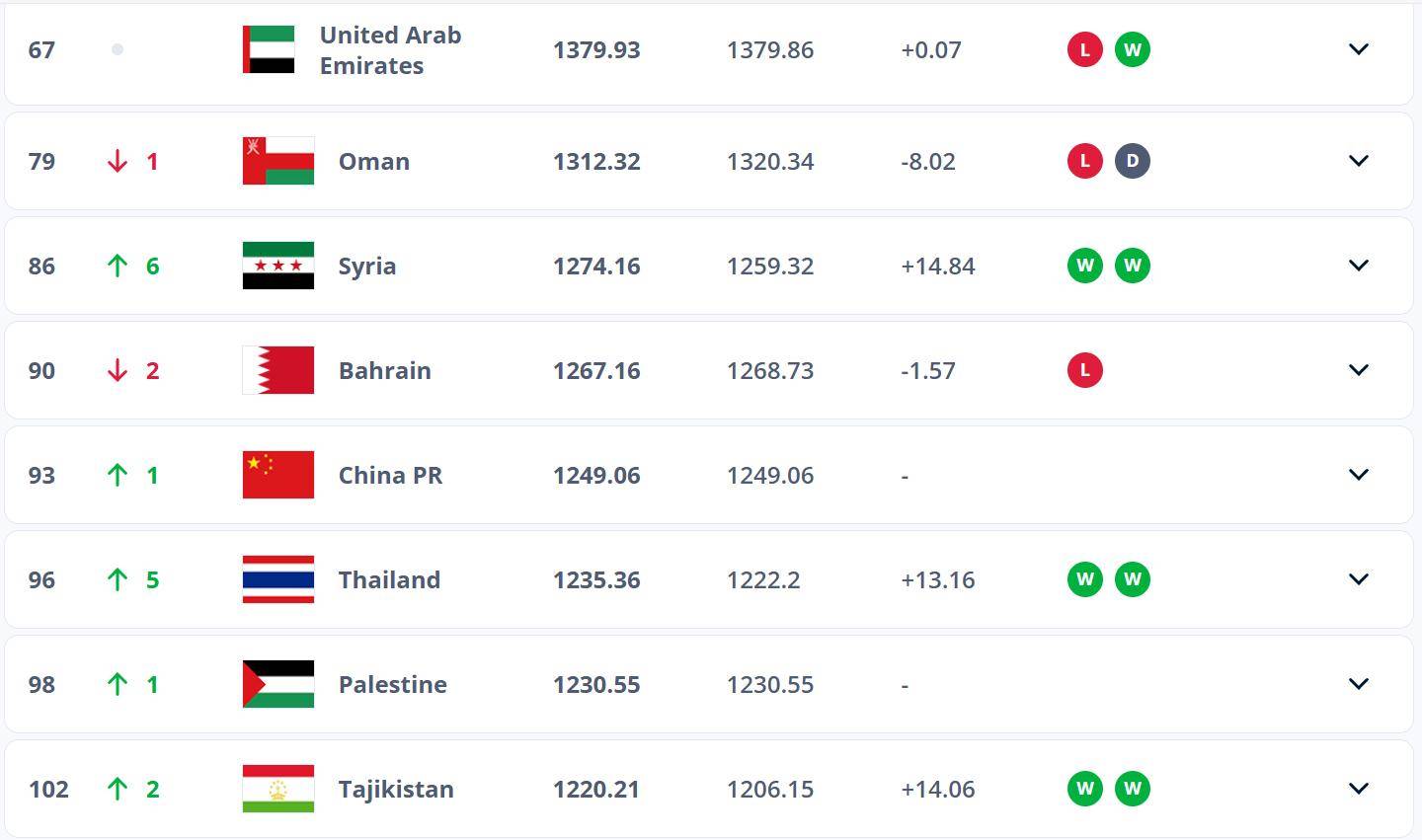 与其他积极比赛的球队不同,国足的停滞不前本身就是一种退步。在第93位附近,还有两支令人意外的队伍:叙利亚队和巴勒斯坦队。令人费解的是,为什么在战火中的国家,仍然能培养出像样的足球队伍?