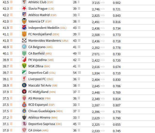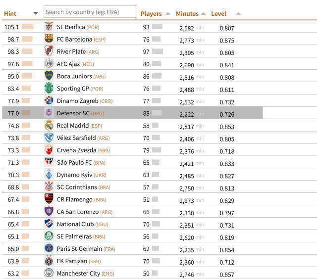 西班牙共有8家俱乐部上榜,除了巴萨和皇马,还包括皇家社会、毕尔巴鄂竞技、马竞、瓦伦西亚、西班牙人和比利亚雷亚尔。荷甲有4家俱乐部上榜,除了阿贾克斯,还有埃因霍温、阿尔克马尔和费耶诺德。乌拉圭有6家俱乐部入选,除了防守者体育,蒙得维的亚国民、达努比奥、佩纳罗尔、蒙得维的亚流浪者和利物浦等也榜上有名。
