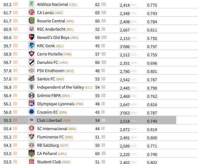 巴西素有“足球王国”之称,巴西球员在全球的数量最多,但在“足球天文台”报告中,排名最好的巴西俱乐部是圣保罗,位列第12,科林蒂安排第14,弗拉门戈排第15,帕尔梅拉斯排第18,桑托斯俱乐部(曾培养出内马尔)排第31。