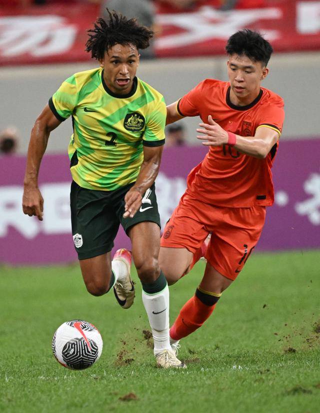 9月9日,中国队球员王钰栋(右)与澳大利亚队球员基利·亚当森在比赛中拼抢。新华社记者 邹竞一 摄