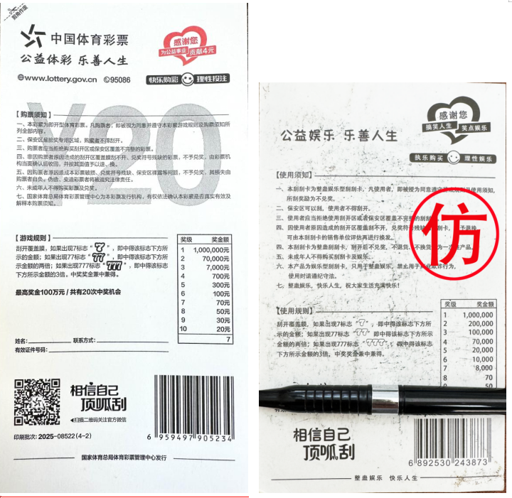 实际上,这些“整蛊彩票”以即开型体育彩票为主。根据国家体育总局体育彩票管理中心发布的声明,即开型体育彩票使用环保纸张和油墨,绿色、健康、易刮开;保安区和刮开区均有覆膜,票面印有防伪装饰纹,图案完整;票面印有体彩、“顶呱刮”标识及面值金额,刮开后的游戏区域有防伪底纹,且游戏符号、奖金标志清晰易辨别。票背印有发行机构、公益金贡献金额和官方网址等信息。
