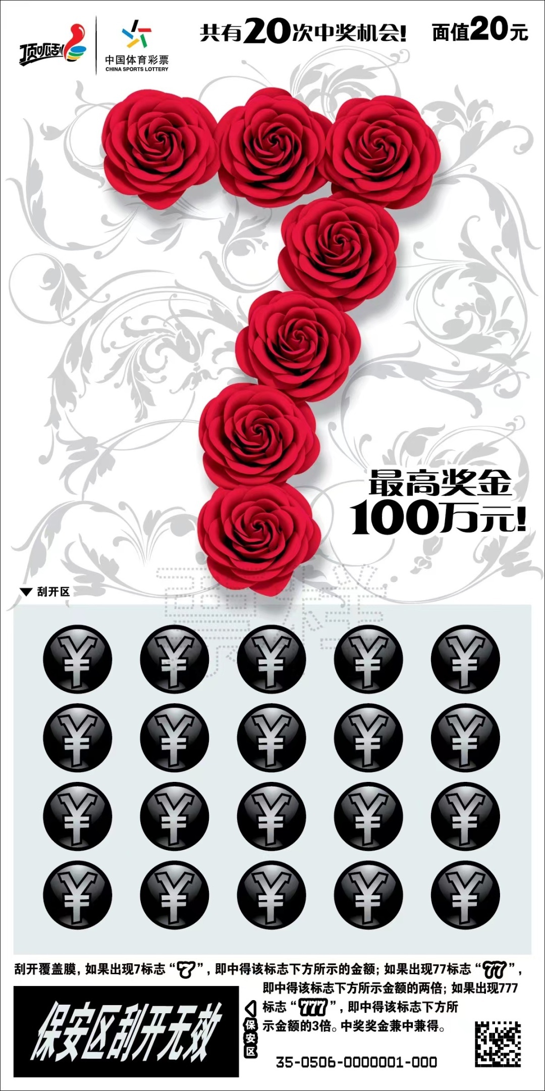 “7”主题票一共有四个票面场景,其中由红色玫瑰花构成数字7的票面寓意信任与爱情,绝对是节日表白的佳选。值得一提的是,与红玫瑰形成鲜明对比,该主题还有两款票面使用了鲜活清新的绿色,分别是草地和网球构成的数字7,青草香+时尚运动,环保且富有动感的视觉呈现,传递出活力健康的生活态度,寓意着对低碳生活方式的追求。“7”主题票面值20元,共有20次中奖机会,最高奖金100万元。其游戏规则为,刮开覆盖膜,如果出现“7”标志即中得该标志下方所示的金额;如果出现“77”标志即中得该标志下方所示金额的2倍;如果出现“777”标志即中得该标志下方所示金额的3倍。中奖奖金兼中兼得。蕴藏着好运、惊喜与乐趣,能成为聊天的话题、互动的游戏,在快节奏的生活中带给她片刻放松与独特的浪漫,让“7”主题票为你的感情升温助力吧。