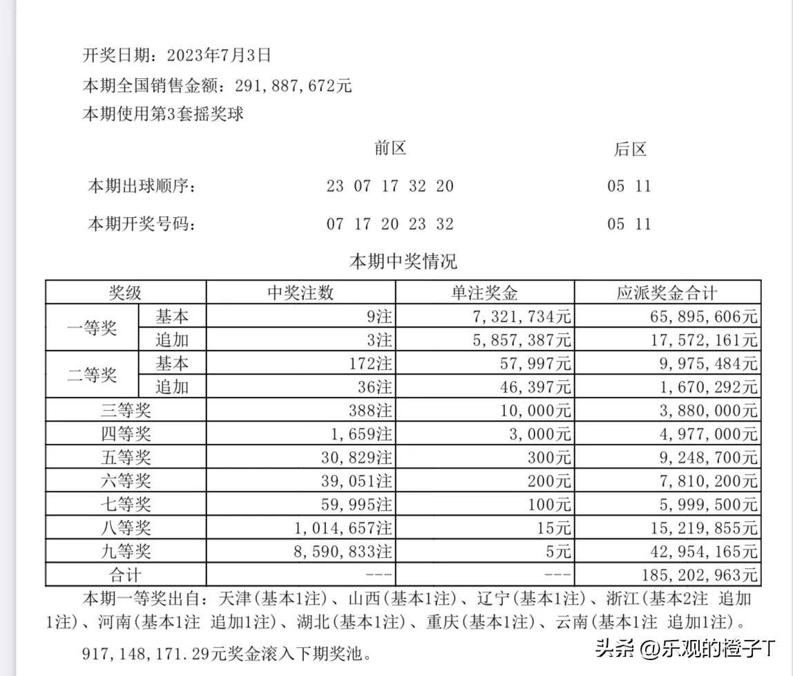 7月3日体彩大乐透23075期开奖日,当期开奖号码为:07.17.20.23.32+05.11,全国共开出一等奖9注,单注基本奖金732万元,其中3注(含追加奖金585万元)。