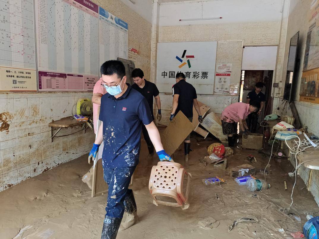 肇庆体彩党支部组织党员深入洪灾后的怀集体彩实体店,开展清淤、发放物资等复工复产工作。