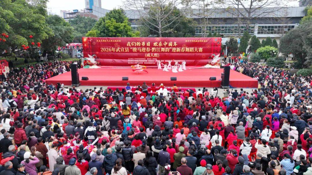 在武宣县马鞍山广场喜气洋洋、热闹非凡。2026年武宣县“骏马迎春·黔江舞韵”迎春舞蹈大赛精彩上演,34支参赛队伍齐聚一堂,以舞会友、以舞贺岁,用活力四射的表演迎接马年新春。