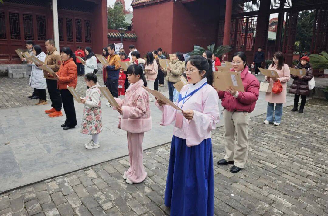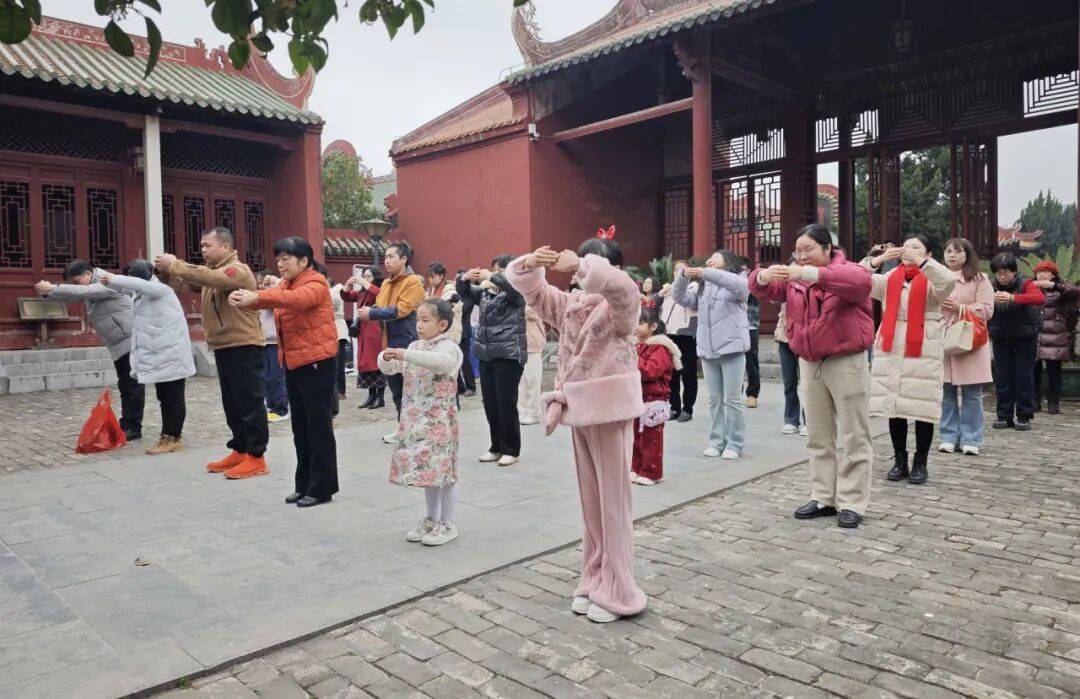 “为天地立心,为生民立命,为往圣继绝学,为万世开太平。”大成殿前,参加活动的群众整齐朗诵。礼仪老师细心向每一位参与者指导新年礼仪,细致讲解不同场合、不同对象的行礼方式。参与者们神情专注,以最标准、最端正的礼仪动作向至圣先师致以崇高礼节。随后全体齐声诵读《论语》经典篇章,表达对先贤智慧的虔诚致敬,积极传承与弘扬中华优秀传统文化。