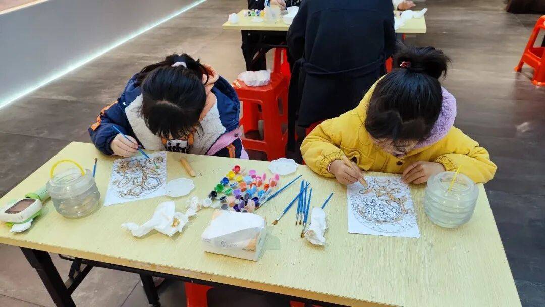 在小夜灯的画板上用金色描线笔描绘模板的图案或者按照自己的想法进行图案创作,然后进行填空涂色,最后将画板插入底座,插上电源,一个漂亮的玻璃画小夜灯就制作完成了。制作完成的玻璃画小夜灯可带回家作为活动留念品。