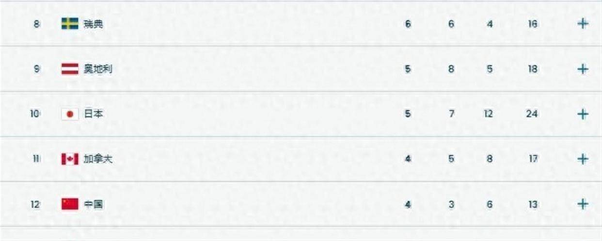 这枚铜牌,让中国代表团在本届冬奥会的奖牌总数增加到了13枚,具体是4枚金牌、3枚银牌和6枚铜牌。根据实时奖牌榜,中国代表团的总排名是第12位。 而在亚洲的竞争对手日本代表团,此时的成绩是5枚金牌、7枚银牌和12枚铜牌,奖牌总数达到了24枚,总排名高居第10位。